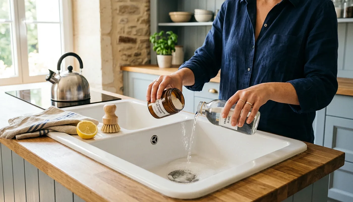 Voici comment procéder concrètement. D’abord, retire physiquement les débris visibles du trop-plein ou du siphon si tu peux y accéder facilement. Ensuite, verse environ 150 grammes de bicarbonate de soude directement dans le drain. Puis, verse un litre de vinaigre blanc sur le bicarbonate. Tu vas observer une mousse qui monte : c’est exactement ce qu’il faut, car c’est cette réaction qui va décoller les graisses et cheveux. Laisse agir pendant 30 minutes à 1 heure sans utiliser l’évier.
